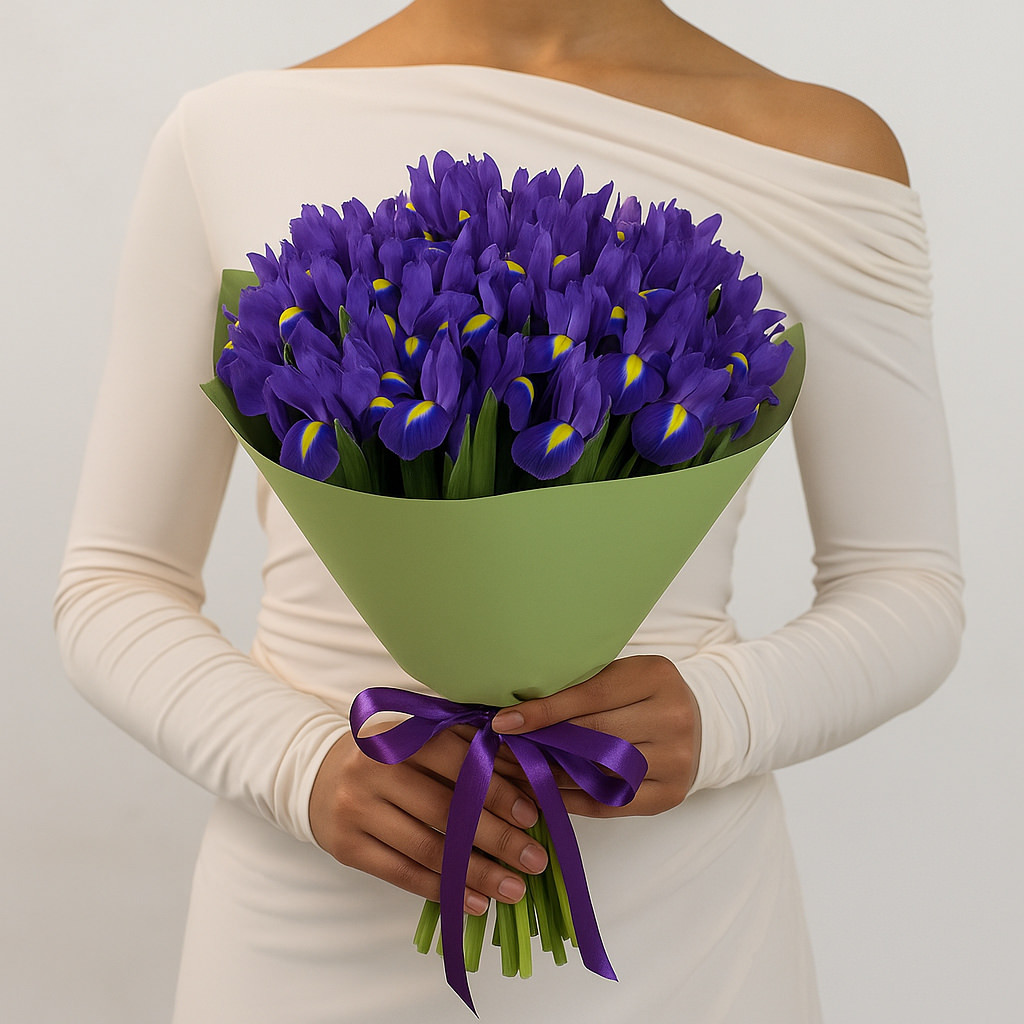 Изысканный букет из ярких фиолетовых ирисов — смелый и стильный подарок для самых особенных моментов. Глубокие оттенки и выразительные формы цветов создают атмосферу утончённости и дарят море вдохновения. Подойдёт как для торжественного события, так и для приятного сюрприза без повода.