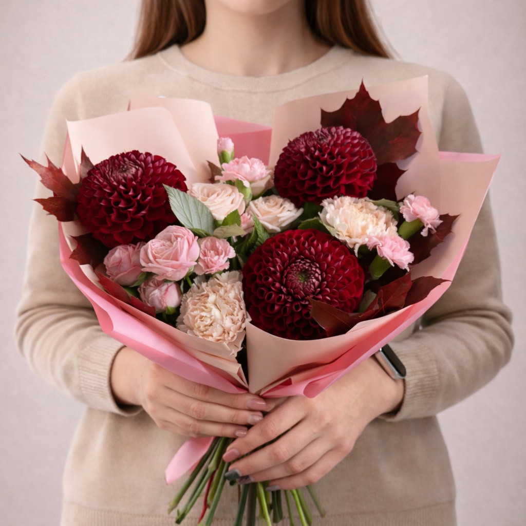 | Состав: | Гвоздики, Георгины, Кустовые розы |