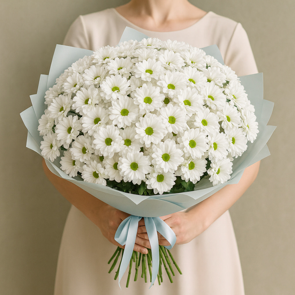 Элегантный букет из белых кустовых хризантем в стильной голубой упаковке — знак искренности и утончённого вкуса. Белоснежные цветы с изумрудными серединками подчеркнут торжественность момента и подарят радость близким.