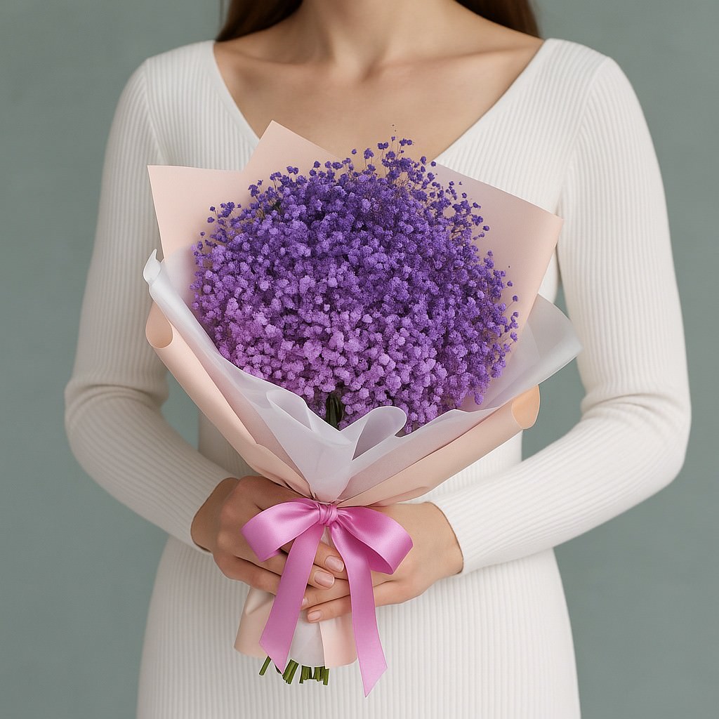 Очаровательный букет из гипсофилы в нежных фиолетово-сиреневых оттенках. Лёгкое воздушное облако цветов создаёт атмосферу нежности, романтики и уюта. Такой букет станет трогательным подарком для любимого человека и подчеркнёт самые светлые чувства.