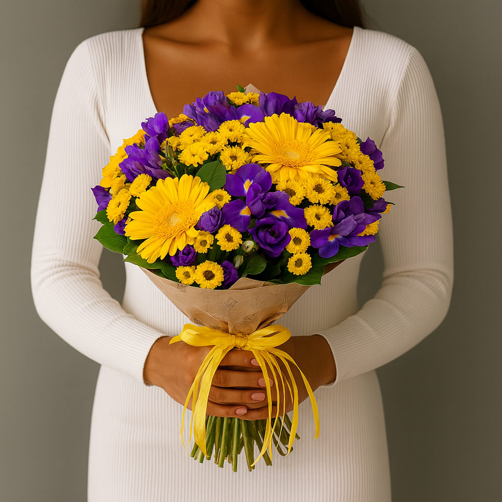Яркая и жизнерадостная композиция, в которой сияние желтых гербер и хризантем сочетается с глубиной фиолетовых ирисов. Этот букет наполняет атмосферу энергией и оптимизмом, идеально подойдёт для подарка, когда хочется подарить улыбку и хорошее настроение.