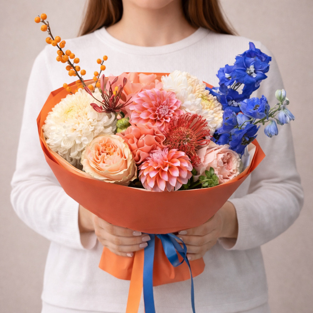 Букет «Цветовой баланс» — это стильная композиция, в которой гармонично переплетаются тёплые и холодные оттенки. Персиковые и розово-кремовые георгины создают мягкую основу, пионовидные розы добавляют объём и романтичность, а синий дельфиниум вносит свежий контраст и глубину. Декоративные ягоды и зелень придают букету живость и природную естественность.