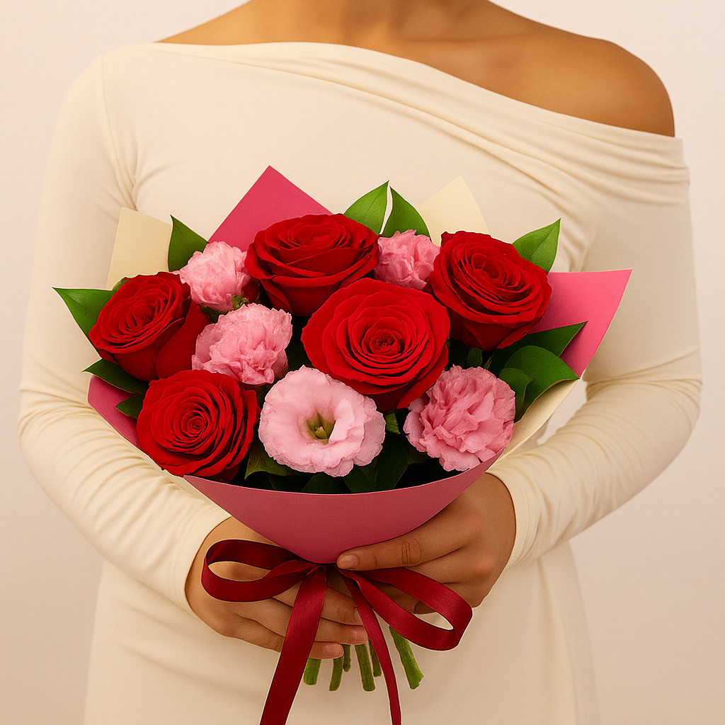 Яркий и стильный букет, созданный для выражения самых искренних чувств. Насыщенные алые розы в сочетании с нежной розовой эустомой и диантусом создают гармонию страсти и нежности. Идеальный подарок для признания в любви, романтического вечера или особого случая.