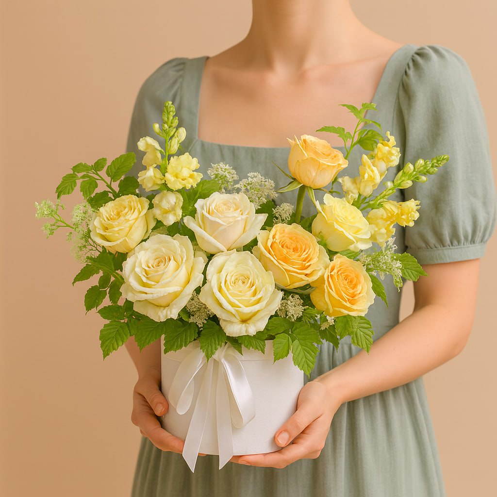 Композиция в коробке «Солнечное утро» — изысканный подарок, наполненный теплом и светом. Яркие жёлтые и нежные кремовые розы создают атмосферу радости и уюта.