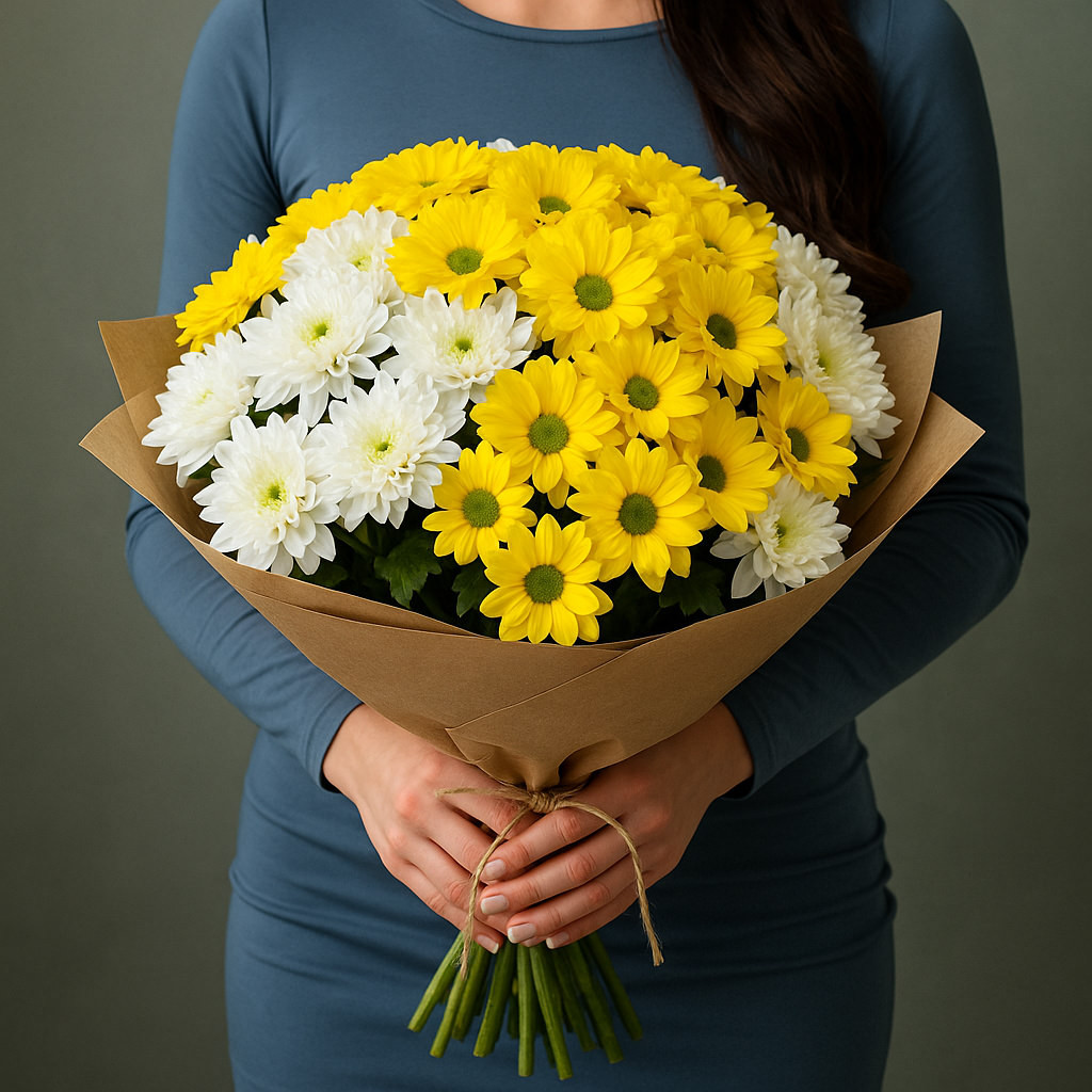 Яркий букет хризантем «Солнечный микс» — это гармония свежести и энергии. Контраст белых и жёлтых оттенков наполняет композицию светом и позитивом, делая её универсальным подарком для любого случая: от дня рождения до корпоративного торжества. Такой букет подчеркнёт вашу заботу и подарит радость адресату.